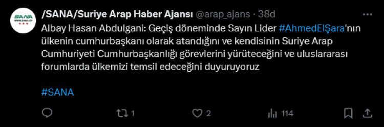 Abdulgani, açıklamasında, “Geçiş döneminde Lider Ahmed El Şara’nın ülkenin Cumhurbaşkanı olarak atandığını ve kendisinin Suriye Arap Cumhuriyeti Cumhurbaşkanlığı görevlerini yürüteceğini ve uluslararası forumlarda ülkemizi temsil edeceğini duyuruyoruz” dedi. Abdulgani, Cumhurbaşkanı’na, ülke için kalıcı bir anayasa onaylanıp yürürlüğe girinceye kadar görev yapacak geçiş dönemi için geçici yasama konseyini kurma yetkisi verildiğini kaydetti.