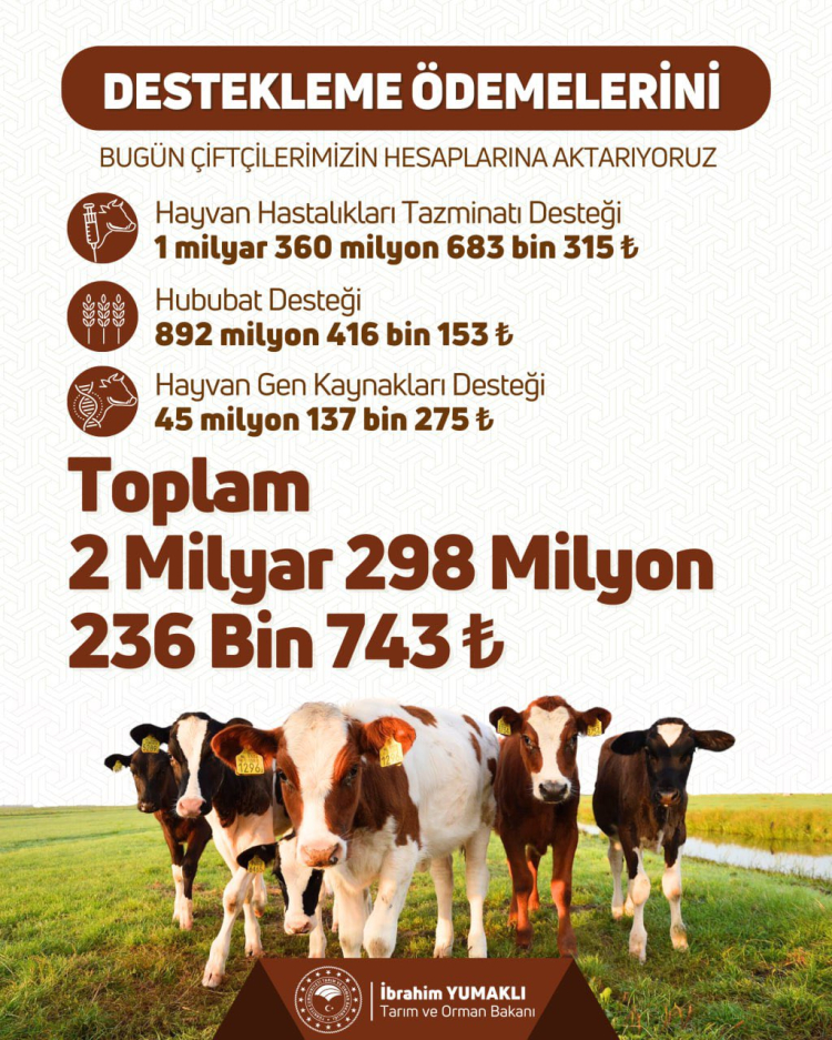 Bakan Yumaklı; destekleme ödemeleri kapsamında Hayvan Hastalıkları Tazminatı Desteği için 1 milyar 360 milyon 683 bin 315 TL, Hububat Desteği için 892 milyon 416 bin 153 TL, Hayvan Gen Kaynakları Desteği için de 45 milyon 137 bin 275 TL ödeneceğini duyurdu.