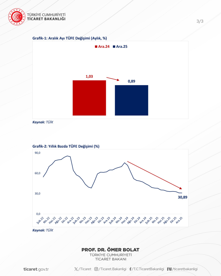 Ticaret Bakanı Ömer Bolat, Aralık 2025’te yıllık enflasyonun yüzde 30,89’a