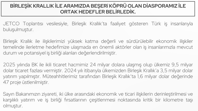 Türkiye ve İngiltere arasında 2021’den bu yana uygulanan serbest ticaret anlaşmasının ikili ticareti son 4 yılda yaklaşık 5 milyar dolar artırdığını aktaran Bolat, geçen yıl ticaret hacminin 24 milyar dolara ulaştığını, hedeflerinin kısa vadede 30, orta vadede ise 40 milyar dolar olduğunu söyledi. Bakan Bolat ayrıca, serbest ticaret anlaşmasının genişletilmesi için müzakerelerin sürdüğünü ve dördüncü turun Şubat ayında yapılacağını açıkladı.
