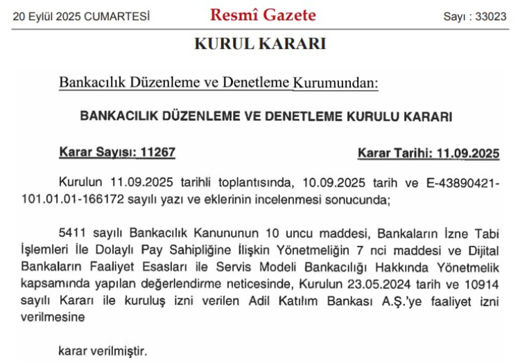 Resmi Gazete’de yayınlanan karar ile Adil Katılım Bankası’na kuruluş ve faaliyet izni verildi.