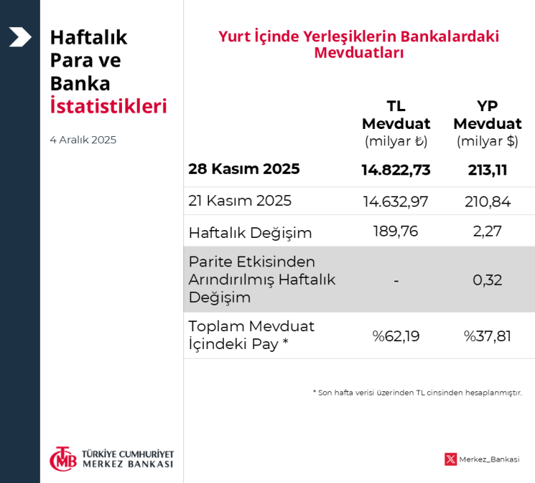 Türkiye Cumhuriyet Merkez Bankası (TCMB), 28 Kasım 2025 haftasına ilişkin para ve banka istatistiklerini yayımladı. Bankacılık sektörünün toplam mevduatı 102,7 milyar TL artarak 16 trilyon 965 milyar liraya ulaştı. Yabancı para mevduatı ise 221 milyar dolar seviyesinde sabit kaldı.