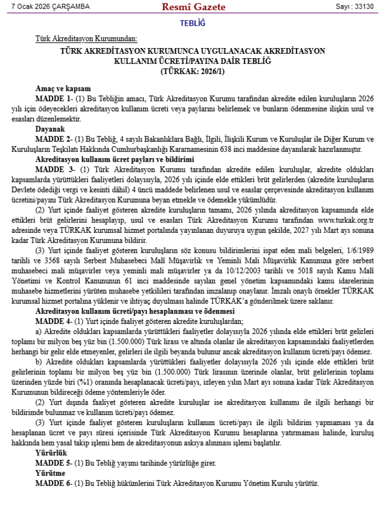 Türk Akreditasyon Kurumu (TÜRKAK), 2026 yılında akredite kuruluşların ödeyeceği akreditasyon kullanım ücreti ve paylarına ilişkin usul ve esasları belirledi.