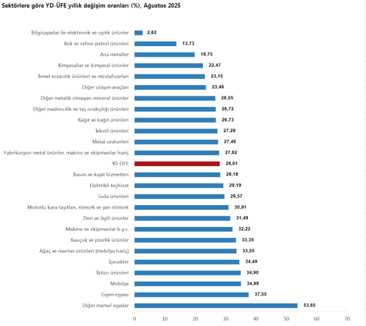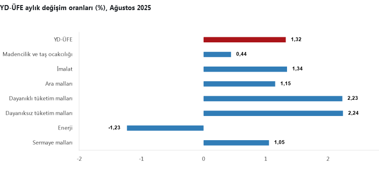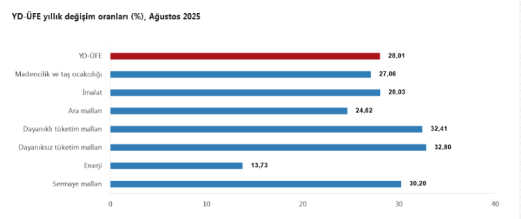 TÜİK, Ağustos 2025 Yurt Dışı Üretici Fiyat Endeksi’ni (YD-ÜFE) açıkladı. Endeks aylık yüzde 1,32, yıllık yüzde 28,01 artış gösterirken, imalat sektöründe yıllık değişim yüzde 28,03 olarak kaydedildi. Dayanıklı ve dayanıksız tüketim mallarının başı çektiği artışlarda, sektörel bazda en yüksek artış diğer mamul eşyalarda oldu.