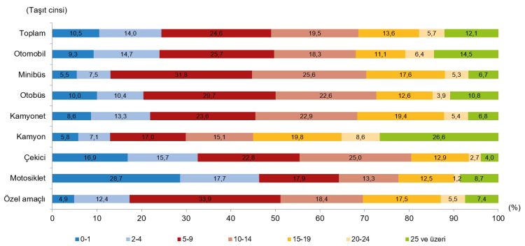 Türkiye’de 2023 yılında katedilen toplam mesafe taşıtların yaş gruplarına göre incelendiğinde; en fazla yol yüzde 24,6’lık oranla taşıt filosunun yüzde 19,8’ini oluşturan 5-9 yaş grubu taşıtlar tarafından yapılırken, bunu sırasıyla yüzde 19,5 ile 10-14 yaş, yüzde 14,0 ile 2-4 yaş, yüzde 13,6 ile 15-19 yaş, yüzde 12,1 ile 25 yaş ve üzeri, yüzde 10,5 ile 0-1 yaş ve yüzde 5,7 ile 20-24 yaş grubu taşıtlar takip etti. Bu oran otomobillerde 5-9 yaş otomobiller için yüzde 25,7, 10-14 yaş için yüzde 18,3, 2-4 yaş için yüzde 14,7, 25 yaş ve üzeri için yüzde 14,5, 14-19 yaş için yüzde 11,1, 0-1 yaş için yüzde 9,3 ve 20-24 yaş için ise yüzde 6,4 oldu.