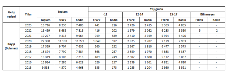 Türkiye’de yaşanan çocuk mağduriyeti ve suçluluğun neden ve boyutlarının belirlenmesine ve iyileştirici tedbirlere temel oluşturacak stratejilere altyapı oluşturmak amacıyla Türkiye İstatistik Kurumu, kayıp çocuklarla ilgili açıklama yaptı. Türkiye genelinde kaybolduktan sonra bulunarak emniyet birimlerine getirilen kayıp (bulunan) çocukların karıştığı olay sayısı tablosunda, 2023’te 7 bin 486’sı kız olmak üzere 15 bin 716 çocuk yer aldı.