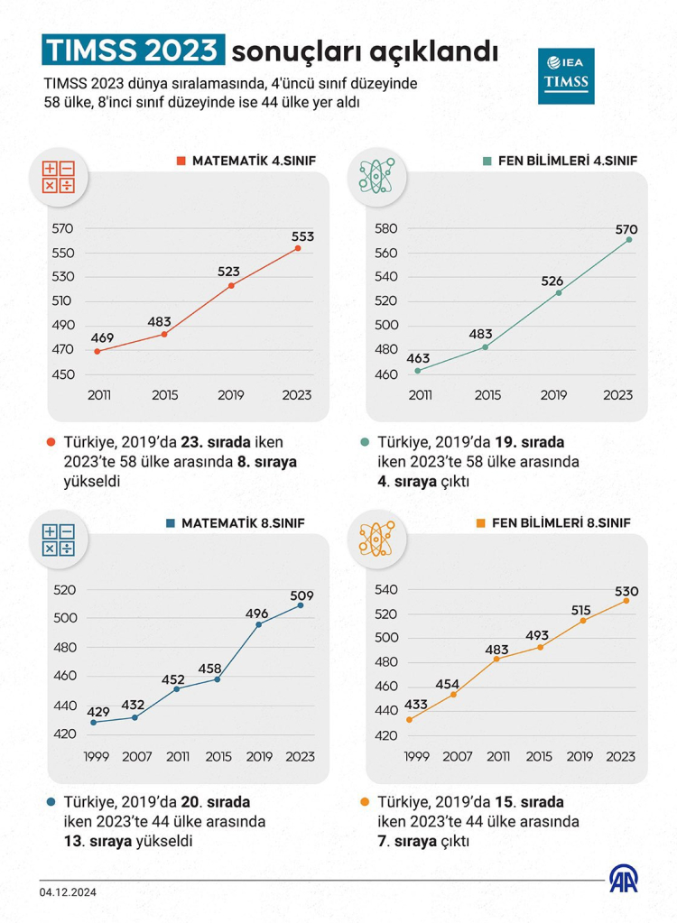Şimşek, paylaşımında, “TIMSS sonuçlarına göre Türkiye her iki alanda da üst sıralara yükseldi. Türkiye 4’üncü sınıf fen bilimlerinde OECD ülkeleri arasında ikinci, Avrupa genelinde ise en yüksek puanı alarak birinci oldu. Başta öğretmenlerimiz olmak üzere tüm eğitim ailemizi, öğrencilerimizi ve velilerimizi canıgönülden tebrik ediyoruz” ifadelerini kullandı.