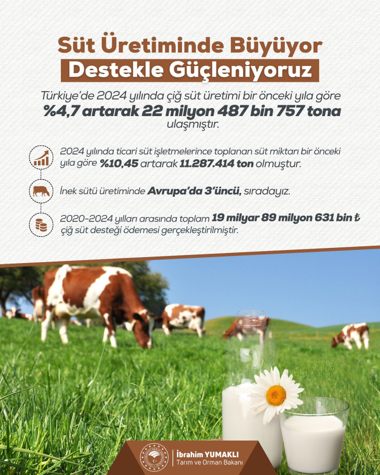 Tarım ve Orman Bakanı İbrahim Yumaklı, 1 Haziran Dünya Süt Günü’nde çiftçilerin emeğini överek, Türkiye’nin süt üretimindeki büyümesini kutladı. Bakan Yumaklı, Türkiye’nin çiğ süt üretiminin önceki yıla göre yüzde 4,7 artarak 22 milyon 387 bin 757 tona ulaştığını açıkladı.