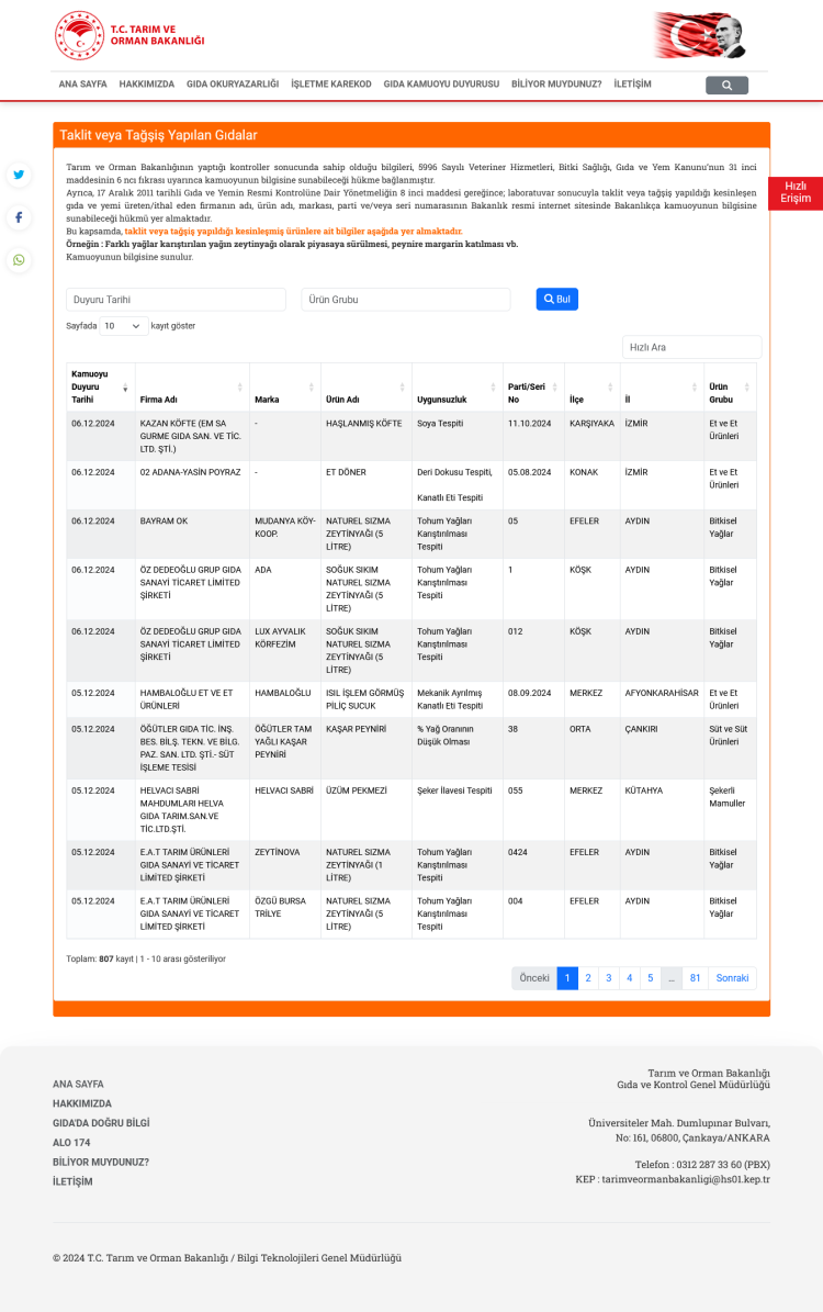 Tarım ve Orman Bakanlığı ‘guvenilirgida.tarimorman.gov.tr’ adresindeki bilgilere ekleme yaptı. Buna göre, kişilerin hayatını ve sağlığını tehlikeye düşürecek şekilde bozulmuş ve değiştirilmiş ürün sayısı 169’a, taklit-tağşiş yapıldığı kesinleşmiş ürün sayısı 807’e yükseldi.