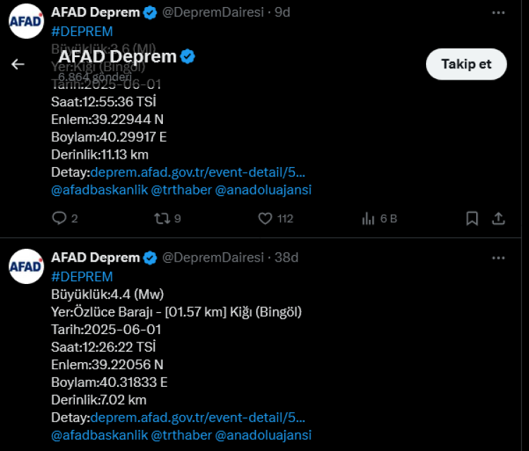 AFAD, Bingöl’de yaklaşık yarım saat arayla iki büyük deprem kaydetti. Saat 12.26’daki 4,4 büyüklüğündeki sarsıntı sonrasında saat 12.55’de 3,6 büyüklüğünde bir deprem daha meydana geldi.