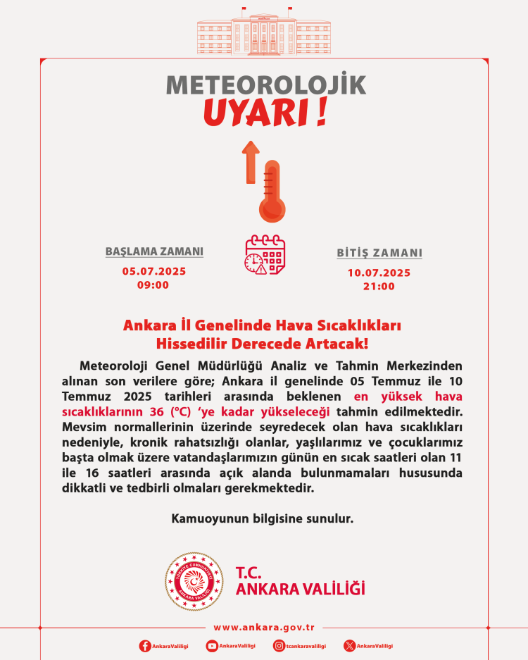Ankara Valiliği, 5 Temmuz Cumartesi gününden itibaren hava sıcaklıklarının hissedilir derecede artacağını duyururken, vatandaşları da sağlık sorunlarına karşı tedbirli olmaları çağrısında bulundu.