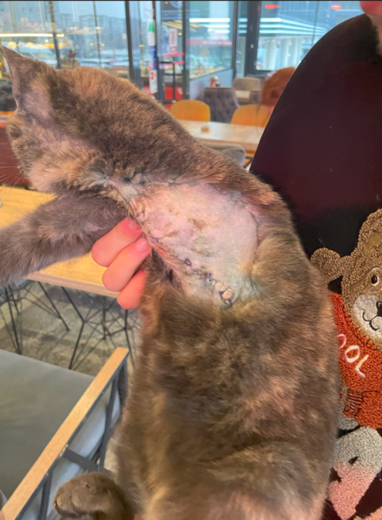 Yaralanmadan birkaç saat sonra olay yerine gelen Nilüfer Belediyesi ekipleri, vatandaşa kediyi tedavi edilmek üzere teslim ettiğine dair imza attırarak kediyi barınağa götürdü. Olaydan bir hafta sonra ekipler, kediyi sol ön bacağı tamamen kesilmiş halde geri getirdi.
