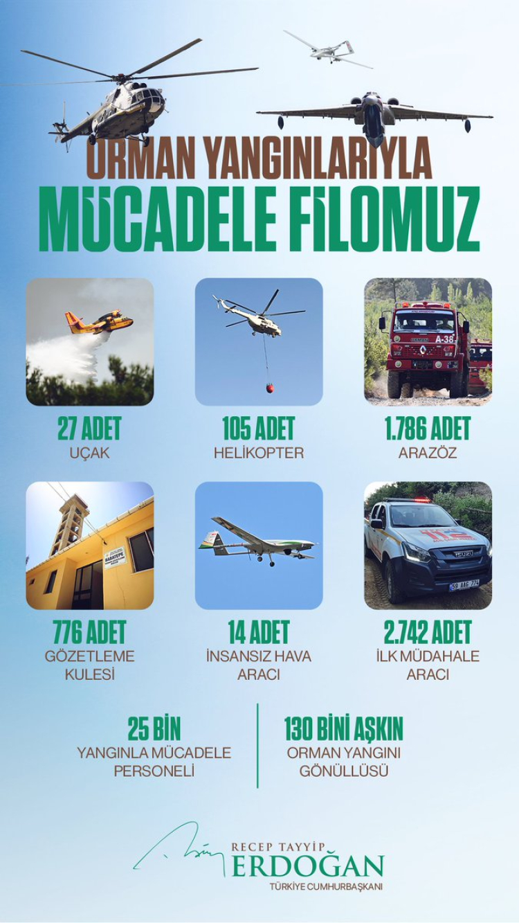Cumhurbaşkanı Erdoğan, Etimesgut’ta “Yeşil Vatan Kahramanları Görev Başında” programında orman filosuna katılan 27 yeni hava araçlarını tanıttı. Orman yangınlarına karşı dikkat çağrısı yapan Cumhurbaşkanı Erdoğan, “Ateş yakmak felakete davetiye çıkarmaktır” dedi.