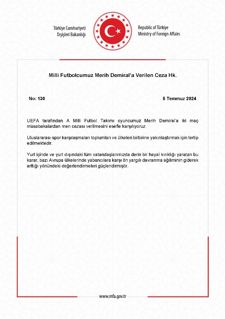 Dışişleri Bakanlığı tarafından yapılan açıklamada, “UEFA tarafından A Milli Futbol Takımı oyuncumuz Merih Demiral’a iki maç müsabakalardan men cezası verilmesini esefle karşılıyoruz” denildi.