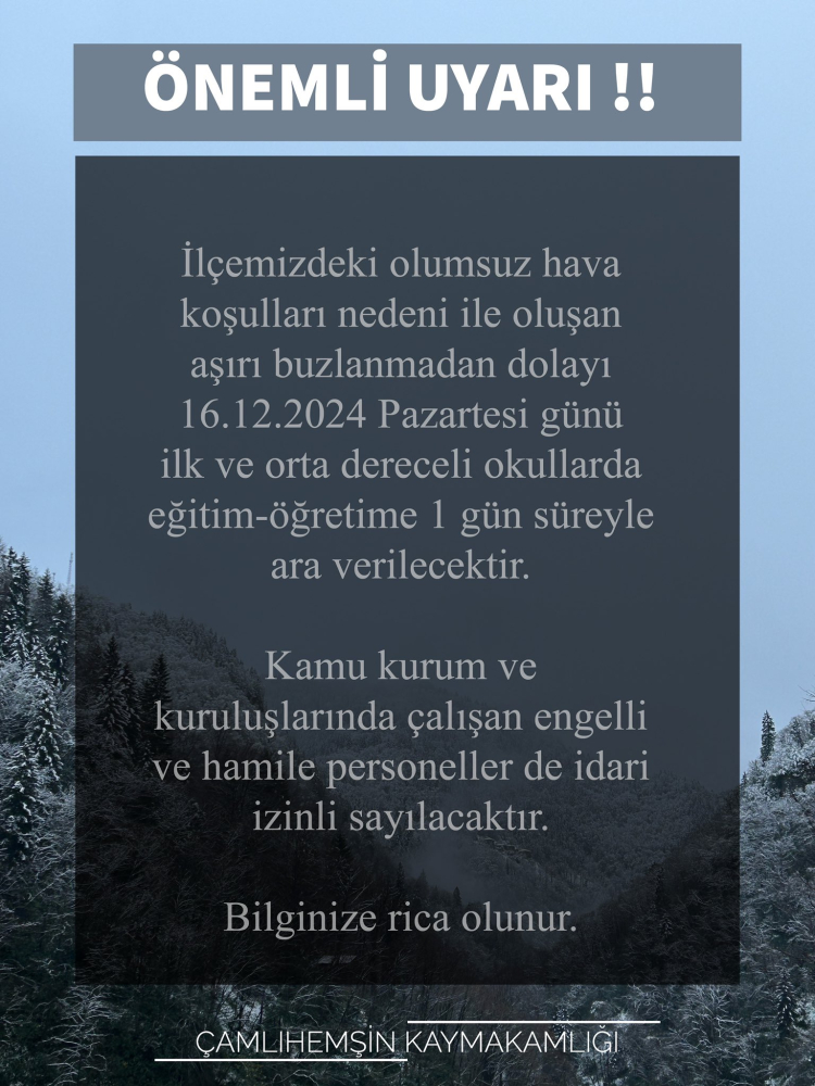 Artvin Valiliği’nden yapılan açıklamada, il genelinde etkili olan ve akşam saatleri itibarıyle iç ve yüksek kesimlerde şiddetini arttırdı. 16 Aralık Pazartesi günü ilk ve orta dereceli okullarla halk eğitim merkezlerinde eğitime ara verildiğini duyuran Valilik, kamu kurumlarında çalışan hamile ve engelli personelin idari izinli sayıldığını belirterek, ekiplerin kar yağışı sonrası zorlu kış şartlarında vatandaşlarımızın güvenliği ve konforu için çalışmalarını kesintisiz sürdürdüğünü bildirdi.