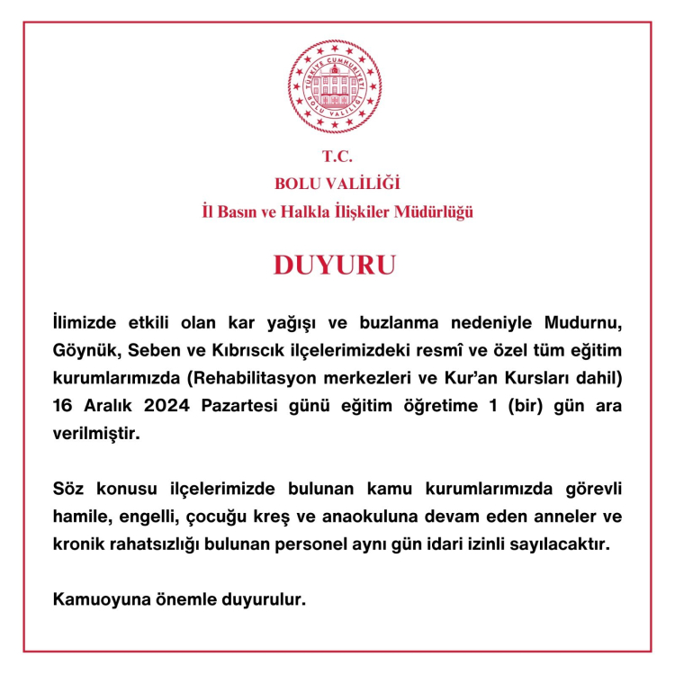 Bolu‘nun yüksek kesimlerinde gün boyu etkili olan kar yağışı, aralıklarla devam etti. Bolu Valiliği, 16 Aralık Pazartesi günü itibariyle kar yağışının süreceği tahmin edilen Mudurnu, Göynük, Seben ve Kıbrıscık ilçelerinde, eğitim ve öğretime bir gün ara verildiğini duyurdu.