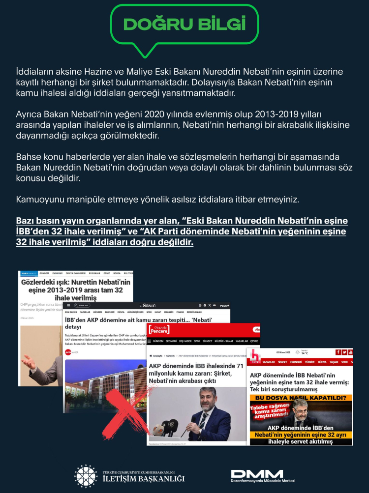 Dezenformasyonla Mcüadele Merkezi tarafından yapılan yazılı açıklamada, “İddiaların aksine Hazine ve Maliye Eski Bakanı Nureddin Nebati’nin eşinin üzerine kayıtlı herhangi bir şirket bulunmamaktadır. Dolayısıyla Bakan Nebati’nin eşinin kamu ihalesi aldığı iddiaları gerçeği yansıtmamaktadır. Ayrıca Bakan Nebati’nin yeğeni 2020 yılında evlenmiş olup 2013-2019 yılları arasında yapılan ihaleler ve iş alımlarının, Nebati’nin herhangi bir akrabalık ilişkisine dayanmadığı açıkça görülmektedir. Bahse konu haberlerde yer alan ihale ve sözleşmelerin herhangi bir aşamasında Bakan Nureddin Nebati’nin doğrudan veya dolaylı olarak bir dahlinin bulunması söz konusu değildir. Kamuoyunu manipüle etmeye yönelik asılsız iddialara itibar etmeyiniz” ifadeleri yer aldı.