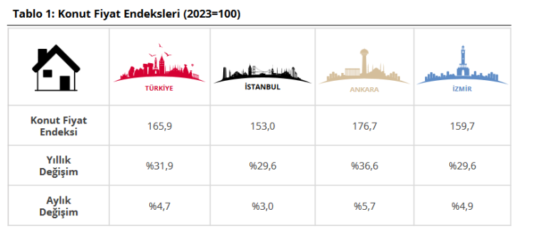 Merkez Bankası’nın açıkladığı istatistiklere göre Türkiye’deki konutların kalite etkisinden arındırılmış fiyat değişimlerini izlemek amacıyla hesaplanan Konut Fiyat Endeksi (KFE) (2023=100), 2025 yılı Ocak ayında bir önceki aya göre yüzde 4,7 oranında artarak 165,9 seviyesinde gerçekleşti.