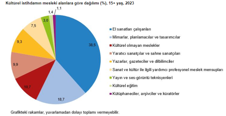 Kültürel istihdamın yüzde 89,3’ünü kültürel meslek alanlarında, yüzde 10,7’sini ise kültürel olmayan meslek alanlarında çalışanlar oluşturdu. Kültürel istihdamda olanların yüzde 38,5’ini el sanatları çalışanları, yüzde 18,7’sini mimarlar, planlamacı ve tasarımcılar, yüzde 9,9’unu yaratıcı sanatçılar ve sahne sanatçıları, yüzde 9,3’ünü ise yazarlar, gazeteciler ve dilbilimciler oluşturdu.