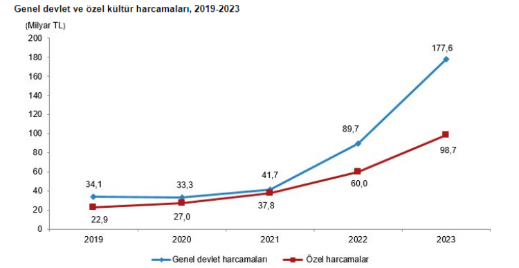 2023 yılında toplam kültür harcamaları içinde genel devlet harcamalarının payı yüzde 64,3 oldu. Genel devlet kültür harcamaları önceki yıla göre yüzde 98,1 artarak 177 milyar 594 milyon 791 bin TL olurken, harcamaların yüzde 67,9’u merkezi devlet bütçesinden gerçekleşti. Genel devlet kültür harcamalarında en yüksek pay yüzde 24,4 ile mimarlık alanında oldu.