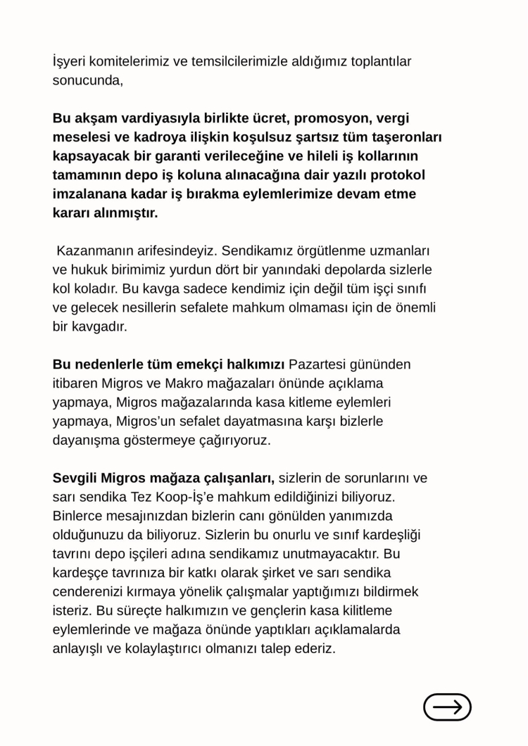 DGD-SEN öncülüğünde Migros depolarında iş bırakan çalışanlar, taşeron uygulamasının sona erdirilmesini, ücretlerin yükseltilmesini ve hakların eşitlenmesini talep ediyor. Sendika, taleplerini güncelledi.