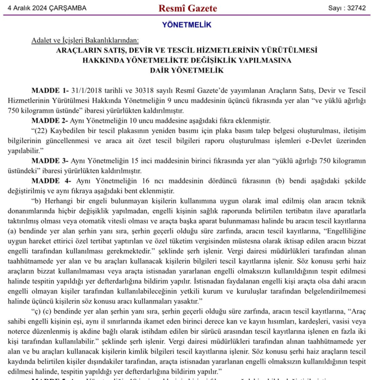 Araçların Satış, Devir ve Tescil Hizmetlerinin Yürütülmesi Hakkında Yönetmelikte Değişiklik Yapılmasına Dair Yönetmelik kapsamında, kaybedilen bir tescil plakasının yeniden basımı için plaka basım talep belgesi oluşturulması, iletişim bilgilerinin güncellenmesi ve araca ait özet tescil bilgileri raporu oluşturulması işlemleri e-Devlet üzerinden yapılabilecek.