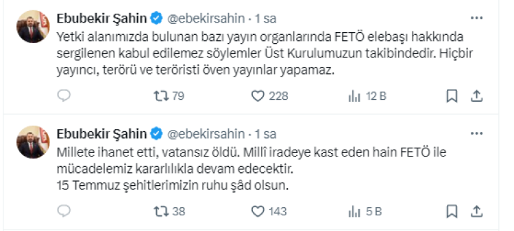 ANKARA (İGFA) – RTÜK Başkanı Ebubekir Şahin, sosyal medya hesabından yaptığı paylaşımda, yetki alanında bulunan bazı yayın organlarında FETÖ elebaşı hakkında sergilenen kabul edilemez söylemlerinin Üst Kurulun takibinde olduğunu açıkladı. Şahin, “Hiçbir yayıncı, terörü ve teröristi öven yayınlar yapamaz” dedi.