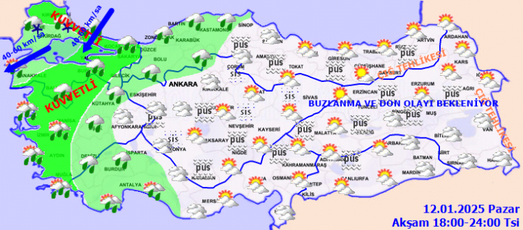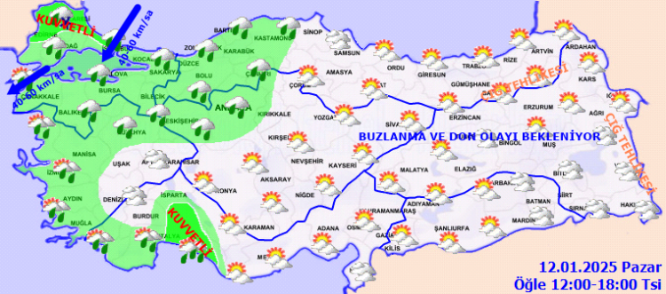 Türkiye’nin iç ve doğu kesimlerinde buzlanma ve don ile birlikte pus ve yer yer sis görülmesi beklenirken, Doğu Karadeniz’in iç kesimlerinin yüksekleri ile Doğu Anadolu’nun yüksek ve dik yamaçlarında çığ tehlikesi bulunuyor. Meteoroloji tarafından yapılan ‘kuvvetli’ uyarılar arasında, vatandaşların yaşayabileceği yağış, buzlanma ve çığ tehlikesine karşı dikkatli ve tedbirli olunması istendi.