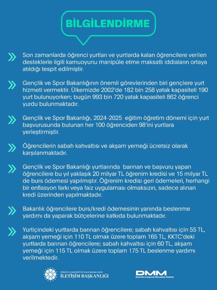 Dezenformasyonla Mücadele Merkezi tarafından yapılan açıklamada, Gençlik ve Spor Bakanlığı’nın önemli görevlerinden biri gençlere yurt hizmeti verdiğinin altını çizilirken, “Ülkemizde 2002’de 182 bin 258 yatak kapasiteli 190 yurt bulunuyorken; bugün 993 bin 720 yatak kapasiteli 862 öğrenci yurdu bulunmaktadır. Gençlik ve Spor Bakanlığı, 2024-2025 eğitim öğretim dönemi için yurt başvurusunda bulunan her 100 öğrenciden 98’ini yurtlara yerleştirmiştir. Öğrencilerin sabah kahvaltısı ve akşam yemeği ücretsiz olarak karşılanmaktadır” denildi.