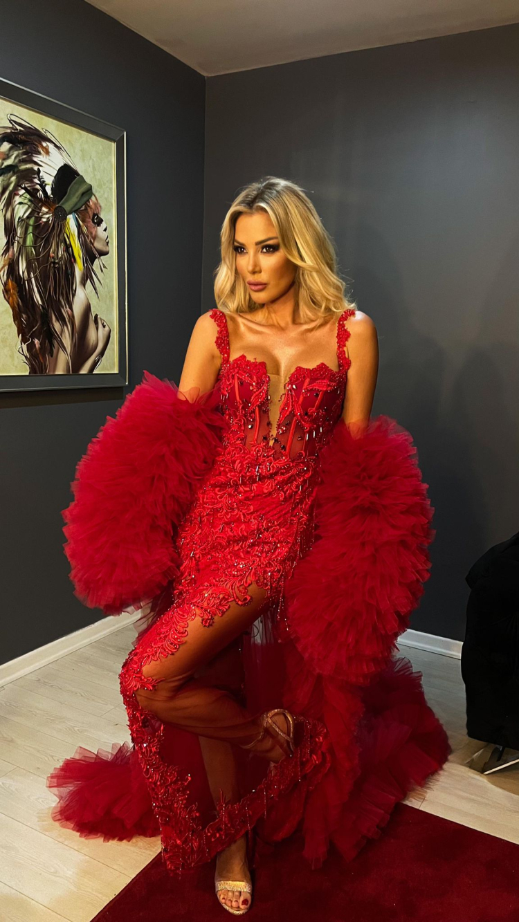 Tamamen el işçiliğiyle hazırlanan, taş işlemeleriyle parlayan kırmızı elbise, sanatçının sahnedeki enerjisini ve asaletini yansıttı.