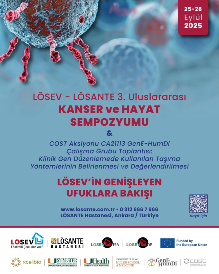 LÖSEV, 25–28 Eylül 2025 tarihleri arasında düzenleyeceği 3. Uluslararası Kanser ve Hayat Sempozyumu ile dünyaca ünlü bilim insanlarını Ankara’da buluşturuyor. LÖSANTE Hastanesi ev sahipliğinde gerçekleştirilecek sempozyumda gen düzenleme, hücresel ve bağışıklık temelli tedaviler ile etik sorumluluklar ele alınacak. Bu önemli bilimsel buluşma, kanser tedavisinin geleceğine ışık tutmayı hedefliyor. LÖSEV ilgilenenleri sempozyuma katılmaya davet ediyor.