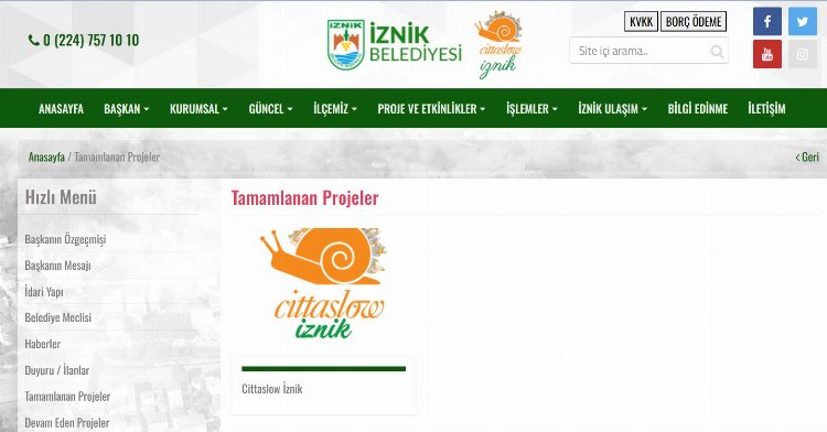 İznik Belediyesi’nin resmi internet sitesinde tamamlanan projelerde İznik’in Uluslararası Sakin Şehirler Ağı Cittaslow üyeliği haricinde başka proje bulunmuyor.