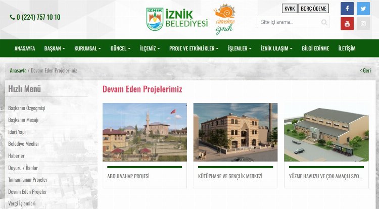 İznik Belediyesi’nin devam eden projelerinde ise, Abdulvahap Projesi, Kütüphane ve Gençlik Merkezi ile Yüzme Havuzu projesi haricinde bir proje çalışması yer almıyor.