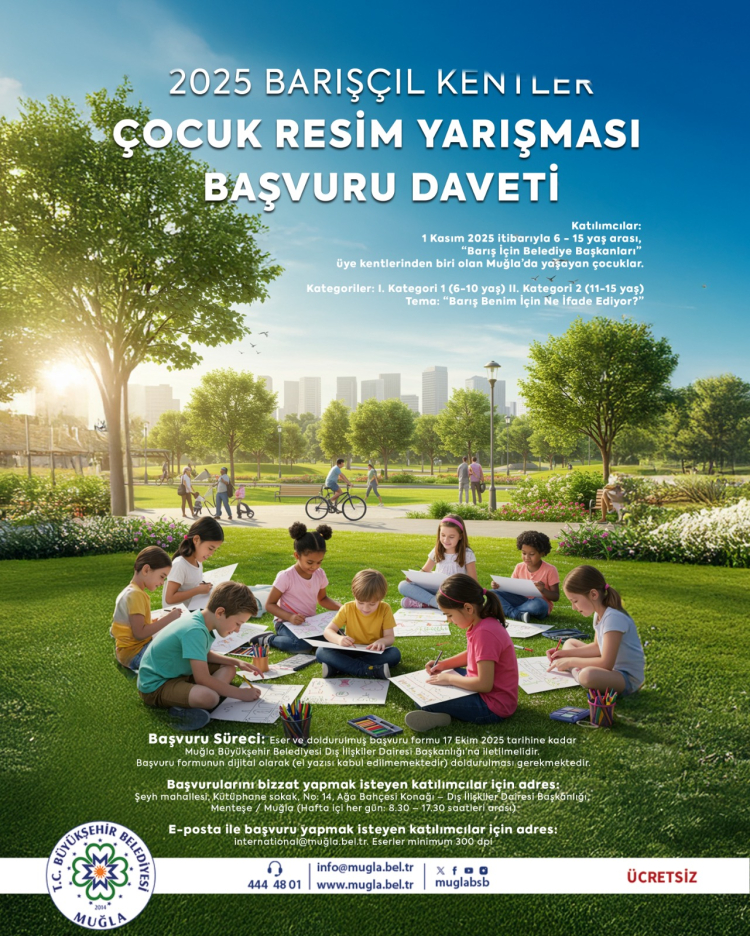 MUĞLA (İGFA) – Japonya merkezli Mayors for Peace – Barış İçin Belediye Başkanları ağı tarafından düzenlenen 2025 “Barışçıl Kentler” Çocuk Resim Yarışması, 6-15 yaş arasındaki çocukların barışa dair hayallerini resim yoluyla ifade etmelerine olanak tanıyor. Muğla Büyükşehir Belediyesi de bu uluslararası yarışmaya başvuru kabul eden üye kentlerden biri olarak çocukları katılıma davet ediyor.