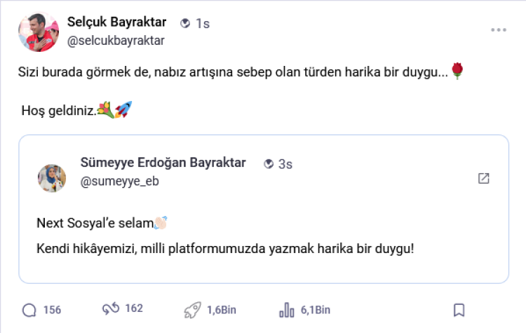 Bayraktar’ın platforma katılımı, takipçileri arasında büyük bir coşkuyla karşılanırken, platformun kurucusu Selçuk Bayraktar, eşi Sümeyye Erdoğan Bayraktar’ın Next Sosyal’e adım atmasını, “Sizi burada görmek de, nabız artışına sebep olan türden harika bir duygu… Hoş geldiniz!” sözleriyle kutladı.